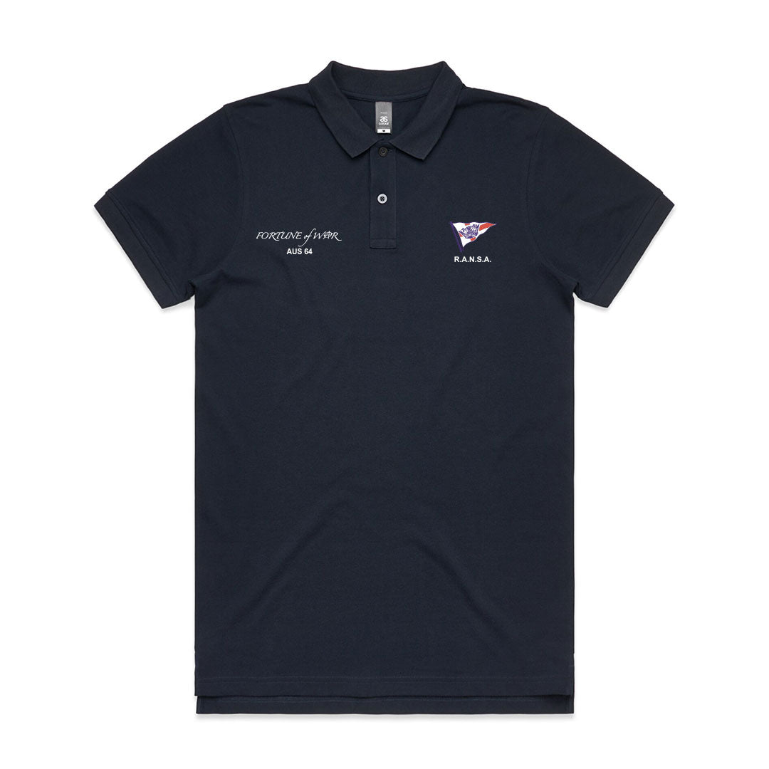 Fortune of War Short Sleeve Cotton Polo made in 100% cotton 240 GSM. RANSA logo at left chest. Fortune of War logo at right chest. Short sleeve collared polo shirt, 2 button placket, tonal buttons, split detail at sides, side seamed, double needle hems, preshrunk to minimise shrinkage