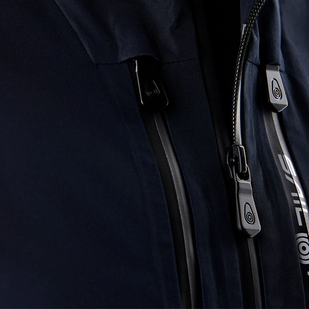 The front features a water-resistant SHZ® zipper along with an internal inner placket to effectively block wind and water intrusion. To further shield against external weather conditions, the cuffs are reinforced with internal Lycra® sleeves and are adjustable with Velcro closures. The fit of the jacket can also be customized at the hem using two internal drawstrings. The jacket features a spacious hood with a high collar and a welded hood brim for water drainage, which can be adjusted for the desired fit using an elastic drawstring at the back of the head.