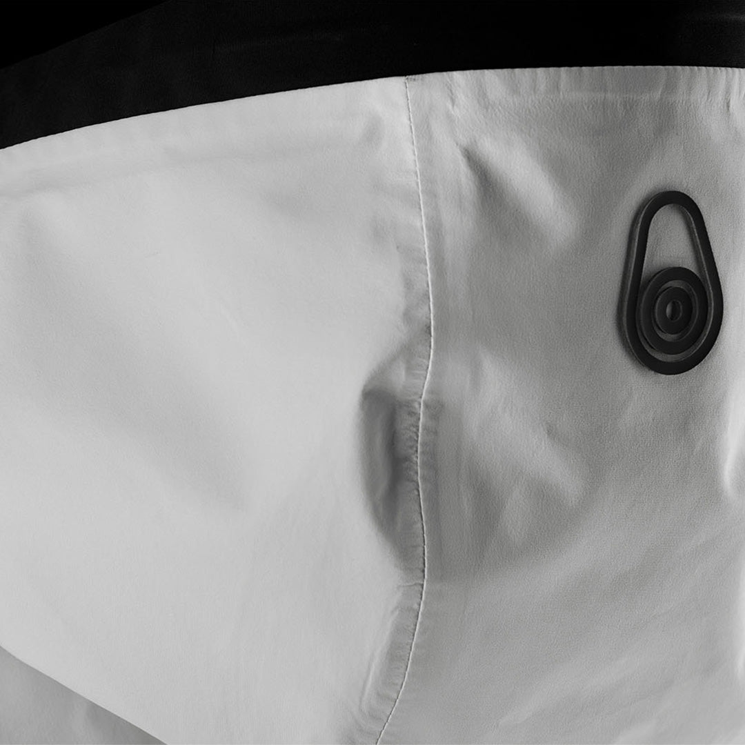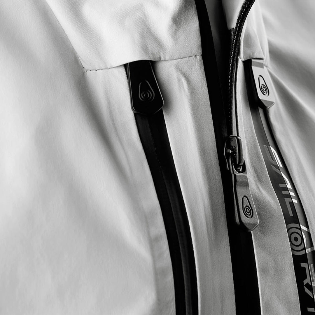 The front features a water-resistant SHZ® zipper along with an internal inner placket to effectively block wind and water intrusion. To further shield against external weather conditions, the cuffs are reinforced with internal Lycra® sleeves and are adjustable with Velcro closures. The fit of the jacket can also be customized at the hem using two internal drawstrings. The jacket features a spacious hood with a high collar and a welded hood brim for water drainage, which can be adjusted for the desired fit using an elastic drawstring at the back of the head.