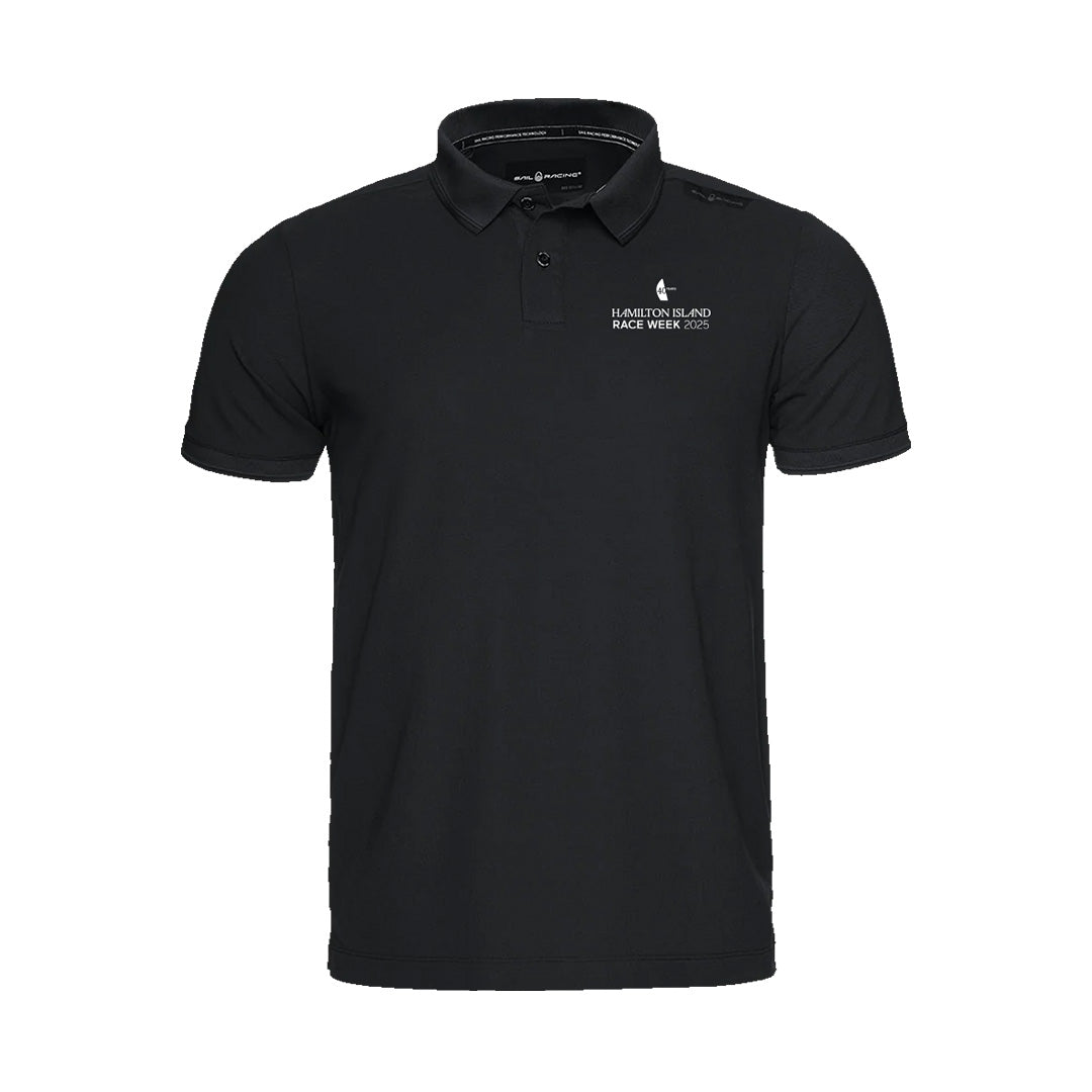 HIRW25 Short Sleeve Tech Polo is made from 100% highly breathable polyester. Hamilton Island Race Week 2025 logo at left chest. Sail Racing logo graphic at shoulder seam and bloc logo at back yoke. Transfer print as main label at inside neck and Sail Racing logo tape at slit. Flat knit for collar and sleeve end.
