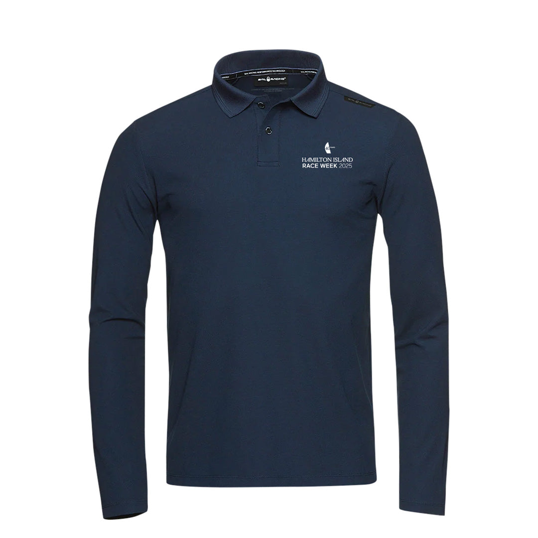 The HIRW25 Long Sleeve Tech Polo is highly breathable, made in 100% polyester. Hamilton Island Race Week 2025 logo at left chest. Sail Racing logo graphic at shoulder seam and bloc logo at back yoke. Transfer print as main label at inside neck and Sail Racing logo tape at slit. Flat knit for collar and sleeve end.