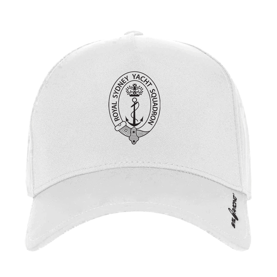 RSYS Crest Cap is constructed in a mix of polyester and elastane with adjustment buckle at the back for best fit. Detail stitches at the brim and stitched eyelets. Royal Sydney Yacht Squadron Burge logo at front. Sail Racing woven print at inside.