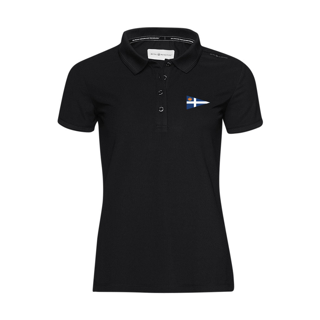 Women's Bow Tech Polo made in 100% polyester with high breathability. Sail Racing logo graphic at shoulder seam and bloc logo at back yoke. Transfer print as main label at inside neck and Sail Racing logo tape at slit. Flat knit for collar and sleeve end.
