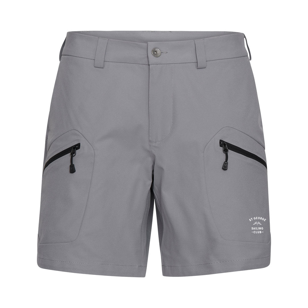 Women's Spray T8 Shorts made in a recycled polyester fabric. Open waist and back pockets. Two spacious pockets at front with zipper closure. Belt loops at the waist. Sail Racing logo embroidery at back pocket.